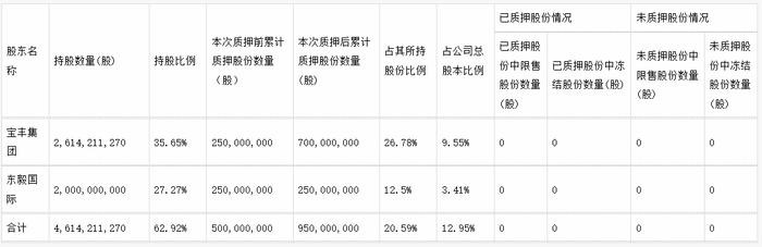 宝丰集团及其一致行动人东毅国际累计质押宝丰能源股份9.5亿股,占其所持股份比例的20.59%,占公司总股本比例的12.95%。